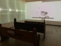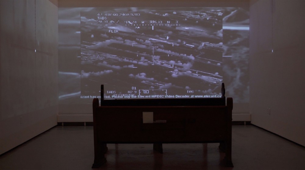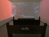 The installation positions the viewer within a spatial dissonance: the pews—symbols of faith, congregation, and reflection—become sites of witnessing, complicity, and mourning. Stories passed down through generations echo alongside grainy footage of targeted landscapes, collapsing personal memory and state-sanctioned violence into the same temporal and visual frame.