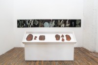 matter of time traces the interwoven temporalities of natural and synthetic materials. Images of various plastic objects are embedded on irregularly shaped shards of bisque-fired Pleistocene clay and are placed inside a vitrine that echoes the aesthetics of archaeological display. The materials that make up the pieces—the wild Pleistocene clay and marine plastic debris—were found along the shorelines of outer Cape Cod during the artist's residency in Provincetown, MA.