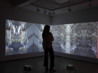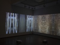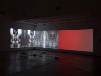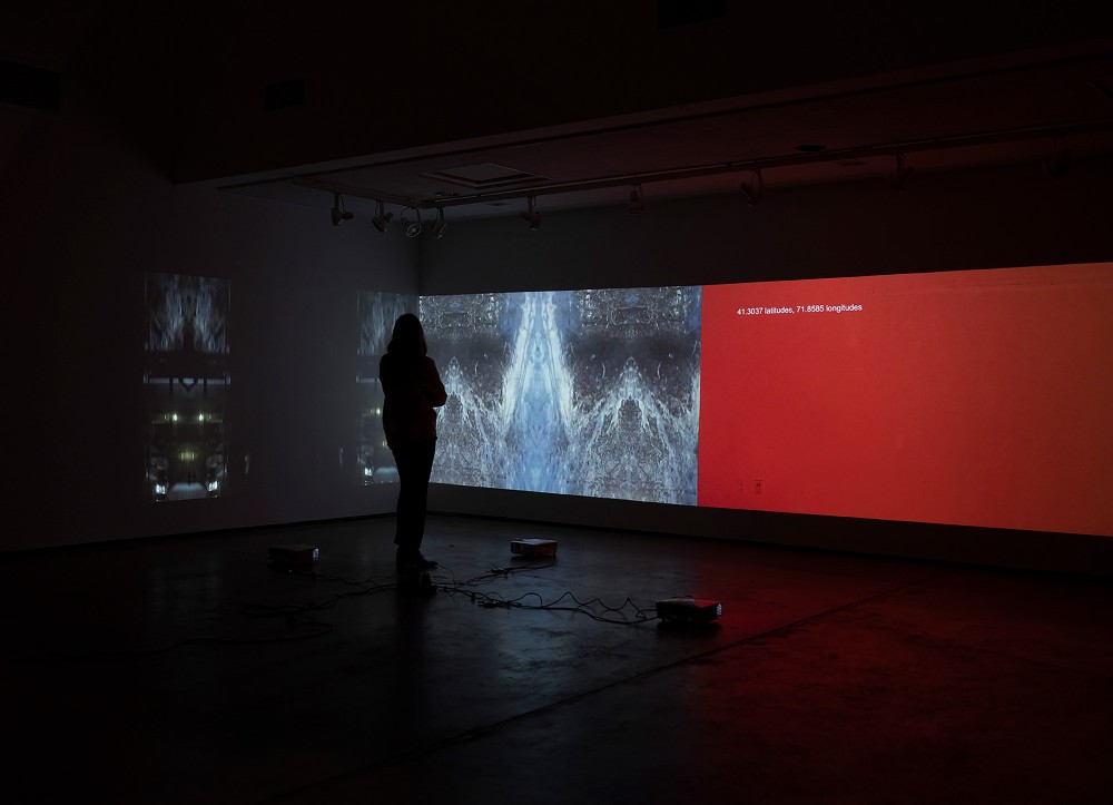 moon city is a three-channel video installation that weaves personal memory with collective unrest, set against the backdrop of Iran’s petrochemical industry. Two vertical, kaleidoscopic landscapes unfold in tandem, their mirrored forms evoking both industrial repetition and optical disorientation. Between them, a slow-moving text emerges on a red field—both a visual pulse and a narrative thread.