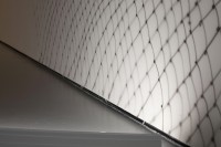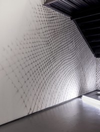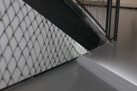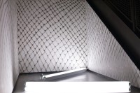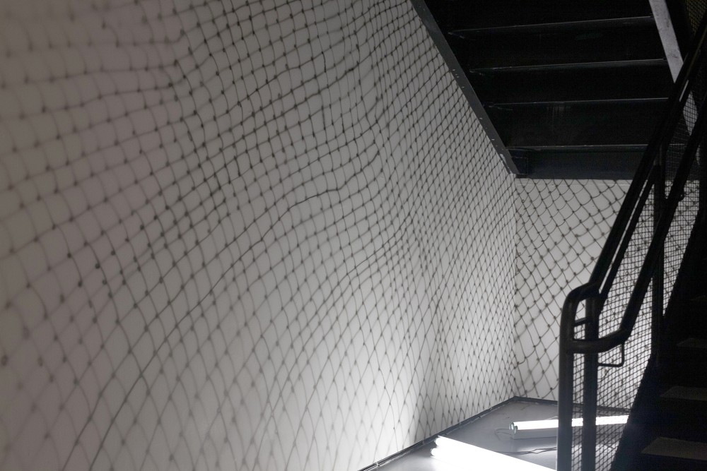 Using an airbrush, this impermanent site-responsive drawing loosely mimics the pattern of the railing to create an immersive experience. Initially, the drawing presents itself as a projected shadow until the difference between the pattern of the railing and the drawing becomes apparent. Rendered directly on the walls, the drawing is located underneath the gallery's staircase where the viewer experiences it as they transition between different floors. The loopy pattern of the drawing resembles a net or a chain link fence that opens and fades at the end, evoking notions of borders, longing, and exile.